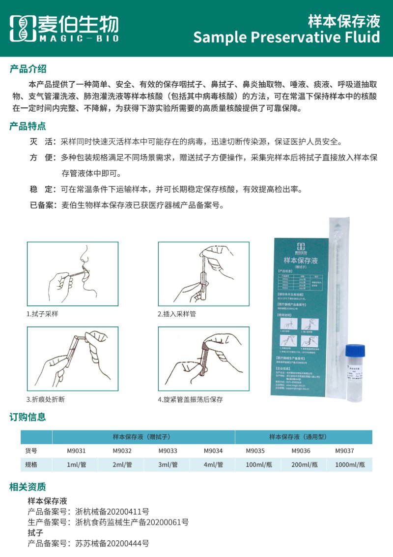 The sample preservation solution of Mai Bo biology can efficiently and effectively preserve virus nucleic acids in samples collected before detection of viruses such as COVID-19, while inactivating viruses to avoid two transmission.